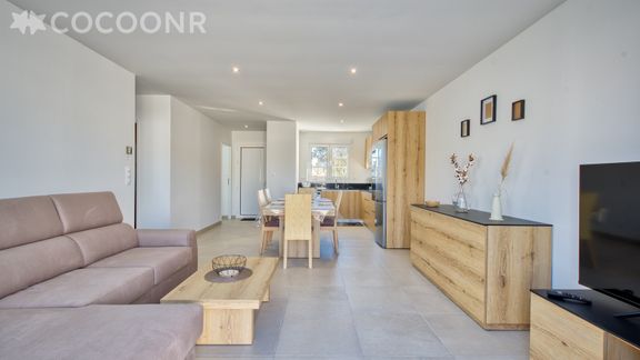 - Une pièce de vie de 29 m² avec TV, canapé-lit double et espace repas