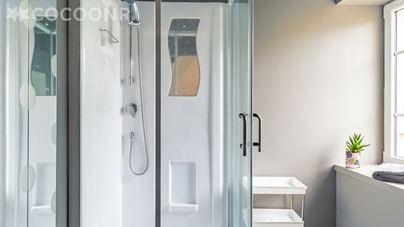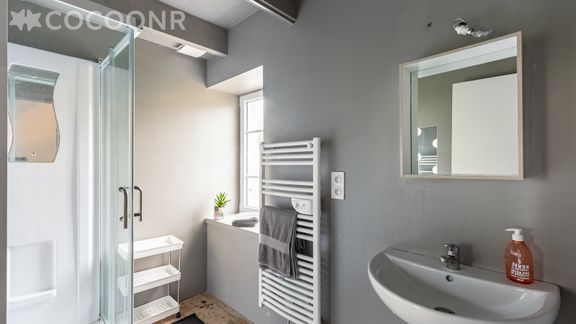 - Une salle d'eau avec une douche, une vasque et un sèche-serviettes chauffant.