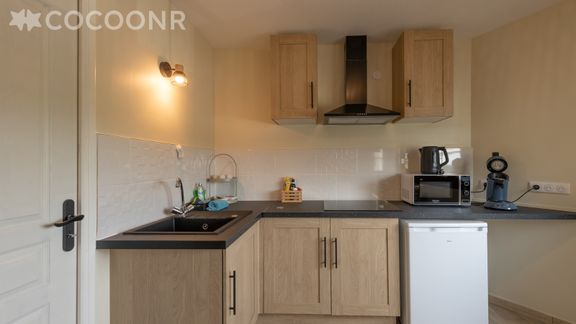 - Une kitchenette équipée avec notamment : bouilloire électrique, four à micro-ondes, plaques de cuisson...
