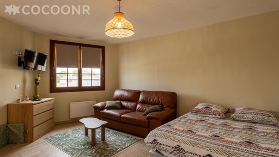 - Une pièce de vie avec TV, canapé et un lit double (140x190)