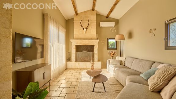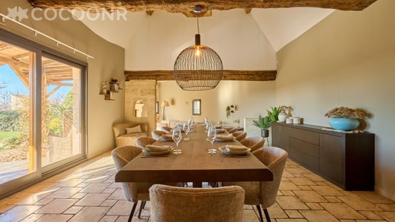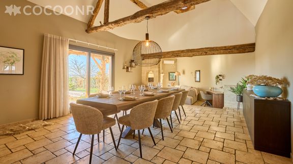 - Une pièce de vie de 80 m² avec TV, canapés et une salle à manger (accessible avec quelques marches)