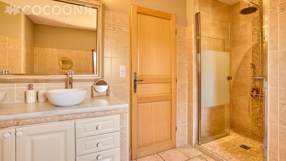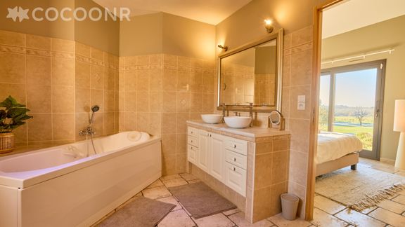 - Chambre 1 : avec 1 lit king-size (180×200) et sa salle de bain attenante (avec baignoire, douche et WC)