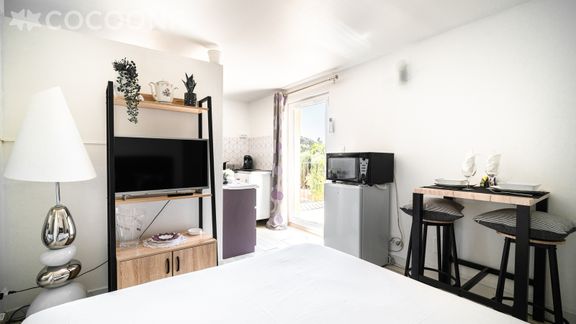 - Une pièce de vie avec TV, coin repas et un espace nuit avec un lit queen size (160x200)