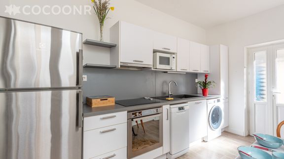 - Une cuisine entièrement équipée : bouilloire électrique, grille-pain, four à micro-ondes, lave-linge, four, plaques de cuisson, lave-vaisselle, cafetière à dosettes tassimo, table à manger...