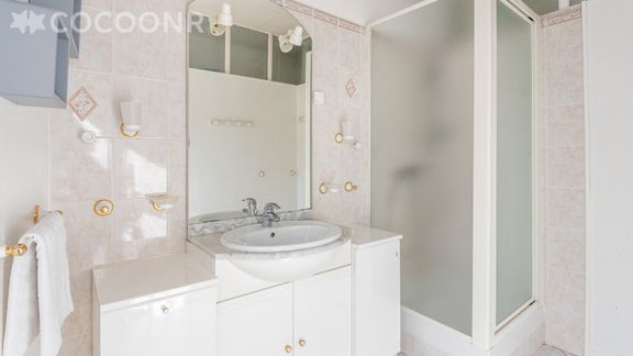 - Une salle d'eau avec une douche, une vasque, un sèche-serviette et un sèche-cheveux.
