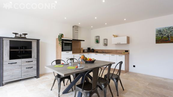 - Une cuisine équipée avec notamment : bouilloire électrique, four, grille-pain, lave-vaisselle, plaques de cuisson...