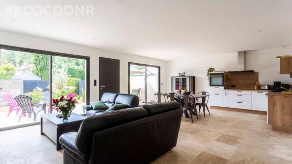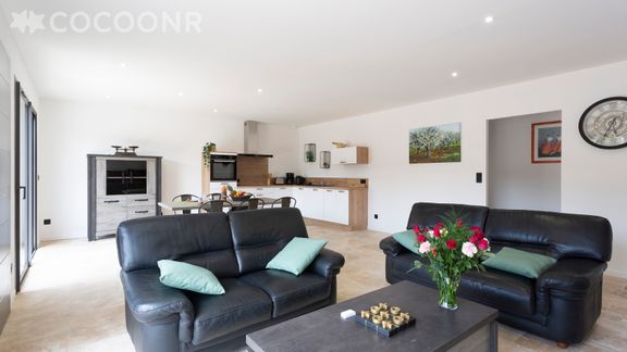 - Une pièce de vie de 44 m² avec TV, fauteuils, table... et coin repas