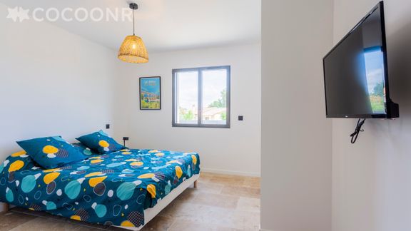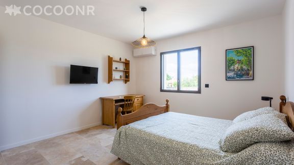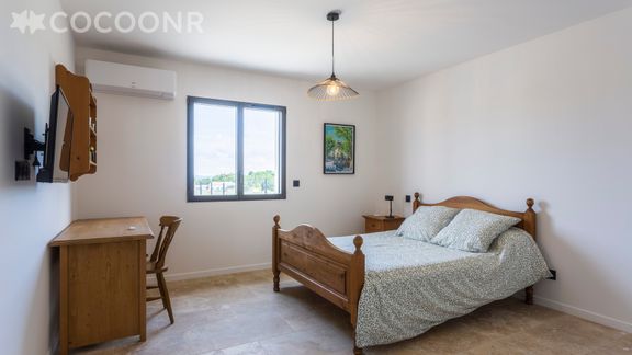- Chambre 1 : Une chambre avec lit double (140×190), TV, placard et bureau