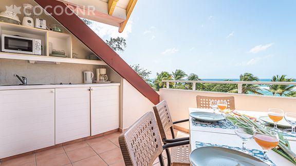 - Terrasse exposée plein sud de 10 m² et aménagée avec une table à manger et une kitchenette équipée : lave-vaisselle, plaques de cuisson, réfrigérateur, micro-ondes, cafetière, grille-pain, vaisselle et couverts... Vous pourrez cuisiner et savourer un bon repas en contemplant la mer et les jardins !
