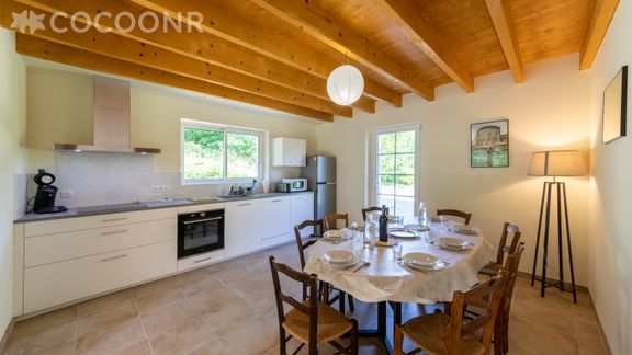 - Une cuisine ouverte équipée avec un coin repas avec notamment : bouilloire électrique, four, four à micro-ondes, grille-pain, lave-vaisselle, plaques de cuisson...