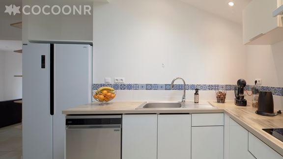 - Une cuisine ouverte, équipée avec notamment : bouilloire électrique, four, four à micro-ondes, lave-vaisselle, réfrigérateur/congélateur, plaques de cuisson...