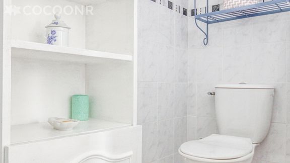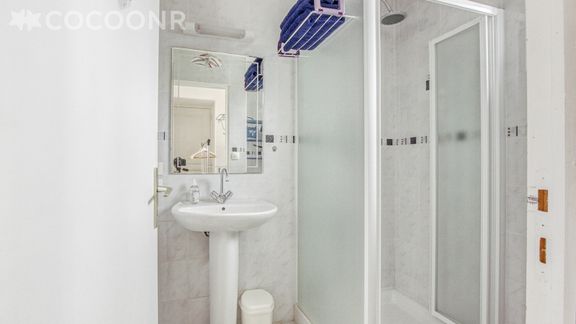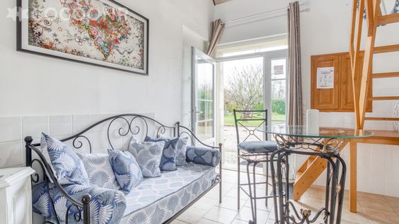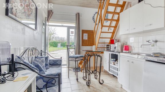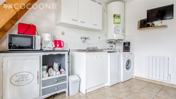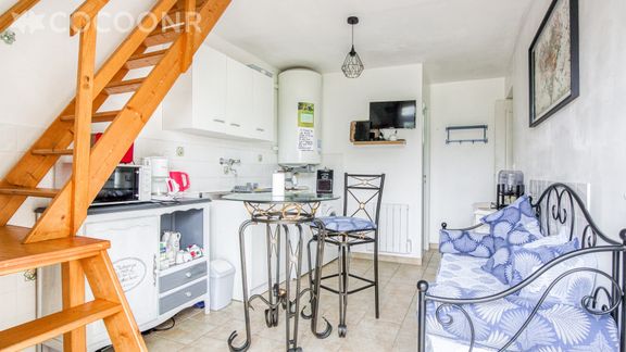 - Entrée au rdc par la pièce de vie comprenant un canapé et une table haute pour manger, une cuisine fonctionnelle équipée de plaques de cuisson, micro-ondes, cafetière et bouilloire, réfrigérateur, lave-linge, etc.