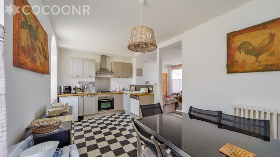 - Une cuisine, ouverte sur la salle à manger, équipée avec notamment : bouilloire électrique, four à micro-ondes, grille-pain, plaques de cuisson...