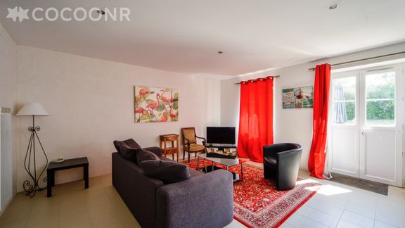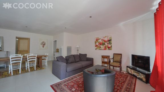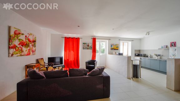 - Une pièce de vie de 46 m² avec TV, canapé, fauteuils et coin repas