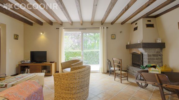 - Une pièce de vie de 50 m² avec canapé, fauteuils, une cheminée, TV