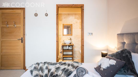 - Chambre 1 : avec un lit double (140×190) et sa salle de bain attenante (avec baignoire, douche et WC), accès balcon