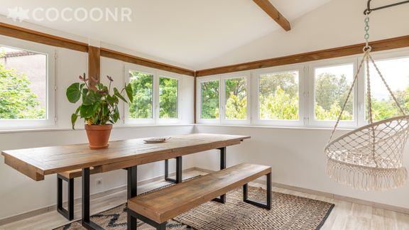 - une véranda salle à manger de 10 places, bordée de lumière grâce à ses nombreuses ouvertures, aménagée avec 1 table en bois capacité 10 personnes, 2 grands bancs et un fauteuil en macramé suspendu.