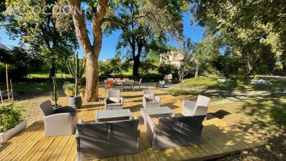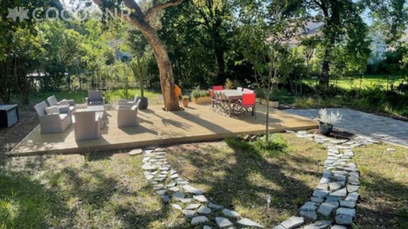 - Grande terrasse ombragée sous le chêne dans le jardin, avec salons de jardin, table, chaises, BBQ, chaises longues, hamac, accessible par la maison en traversant.