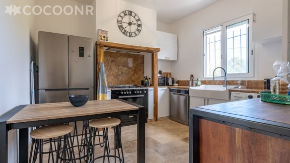 - Grande cuisine séparée entièrement équipée : table à manger, 5 tabourets, lave-vaisselle, lave-linge, réfrigérateur et congélateur, four électrique, piano de cuisson au gaz, micro-ondes, grille-pain, bouilloire, cafetière Nespresso, vaisselle et couverts.