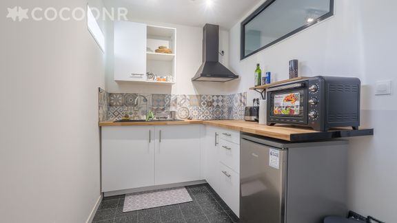 - Une cuisine lumineuse et spacieuse, entièrement équipée : cafetière Nespresso, plaque de cuisson électrique, four, réfrigérateur congélateur, grille-pain, bouilloire, vaisselle et couverts.
