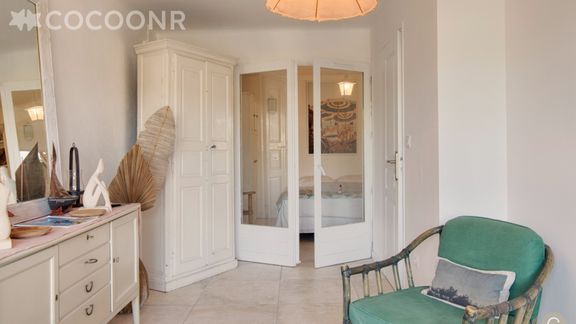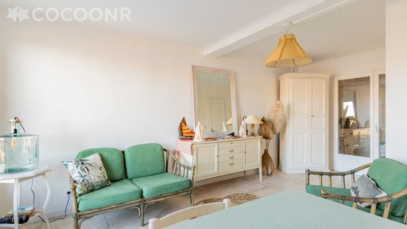 - Grand salon séjour lumineux doté d'une sublime vue sur la mer. Le salon est orienté ouest, et est aménagé avec canapé, TV, espace repas pour 6 convives.
