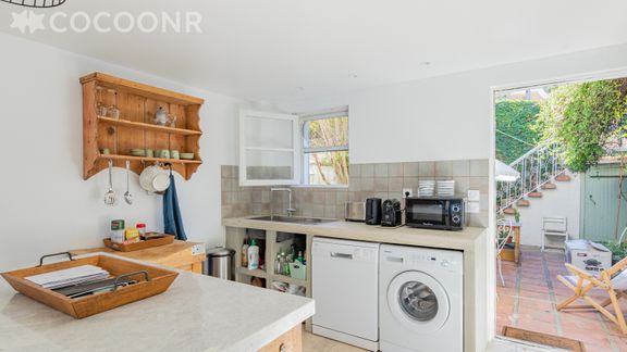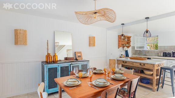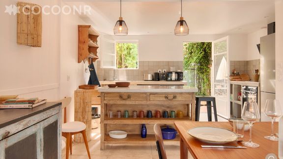 - Cuisine ouverte sur le séjour, et entièrement équipée : lave-vaisselle, four, réfrigérateur, plaques de cuisson, micro-ondes, cafetière, bouilloire, grille-pain, vaisselle et couverts, machine à laver...