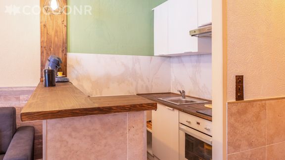 - Une cuisine ouverte équipée avec notamment : bouilloire électrique, four, four à micro-ondes, grille-pain, plaques de cuisson...