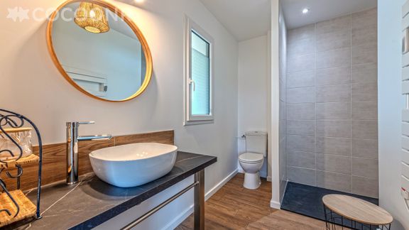 - Chambre 1 : avec 1 lit queen-size (160×200), accès direct à la terrasse, dressing et salle d'eau avec douche à l'italienne et WC