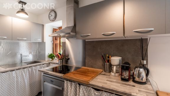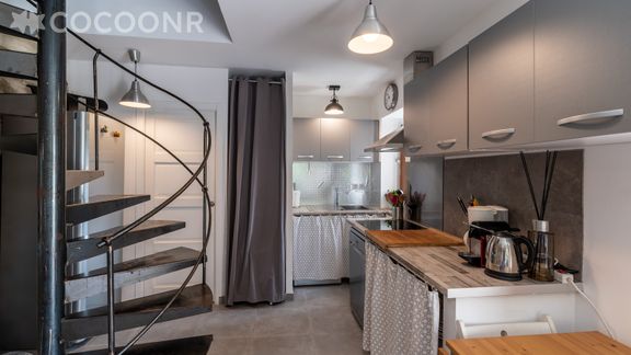 - Une cuisine ouverte équipée avec notamment : bouilloire électrique, four, four à micro-ondes, grille-pain, lave-vaisselle, plaques de cuisson, cafetière à dosettes Nespresso...