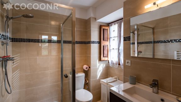 - Chambre 1 : suite parentale avec un lit queen-size (160×200) et une salle d'eau attenante avec douche et WC