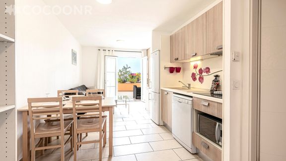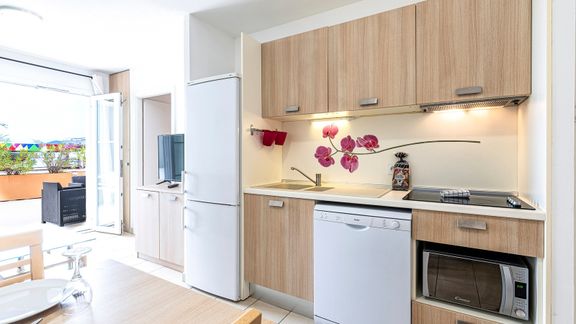 - Une cuisine équipée avec notamment : bouilloire électrique, four à micro-ondes, grille-pain, lave-vaisselle, plaques de cuisson...