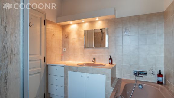 - Une salle de bain avec douche et baignoire