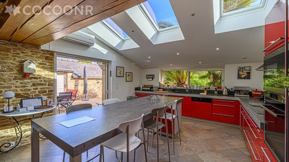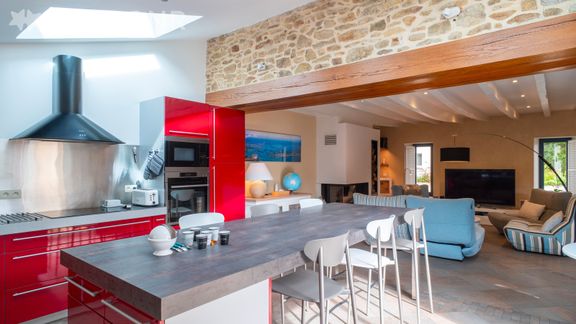 - Une belle pièce à vivre de 67 m² avec salon, grande table à manger pour 10 personnes et cuisine ouverte toute équipée (four, micro-ondes, plaques de cuisson, combiné-cafetière, lave-vaisselle, etc). Vous y trouverez également une autre table pouvant accueillir 6-7 personnes.