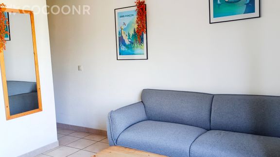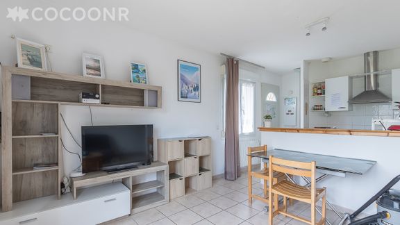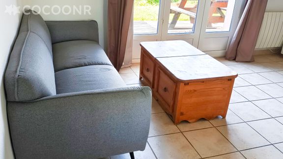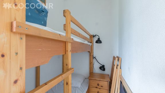 - Une pièce de vie de 15 m² avec canapé, TV et espace nuit avec un lit superposé (2 couchages)