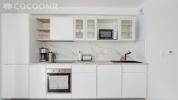 - Une cuisine équipée ouverte avec notamment : bouilloire électrique, four, four à micro-ondes, cafetière à dosettes Nespresso, grille-pain, lave-vaisselle, plaques de cuisson...