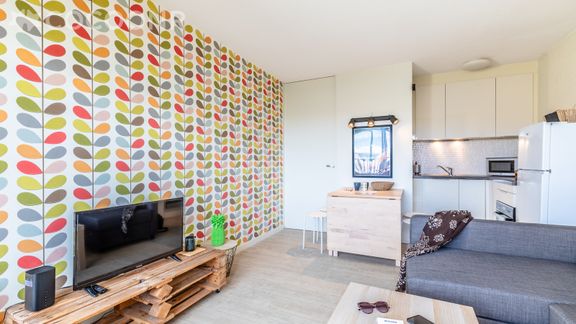 - Une pièce de vie avec TV et un canapé-lit,