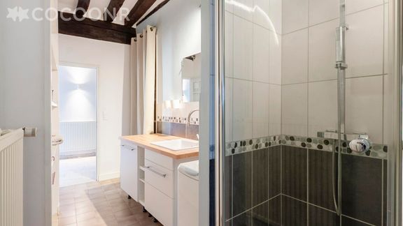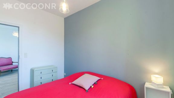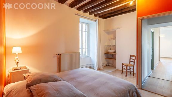 - Chambre 2 : Grande suite parentale composée d'une chambre avec lit double (160 x 190 cm), un lavabo et une armoire. Une deuxième chambre pour enfant est accessible depuis la grande chambre, dotée d'un lit une place.