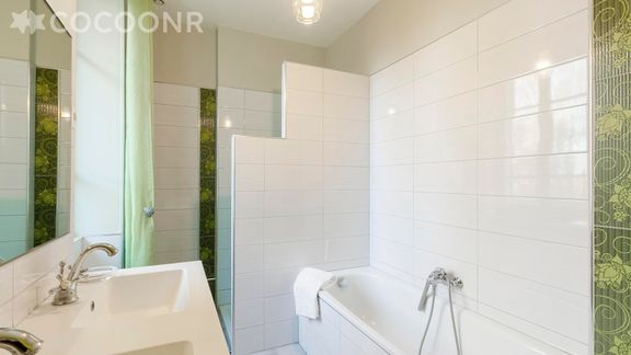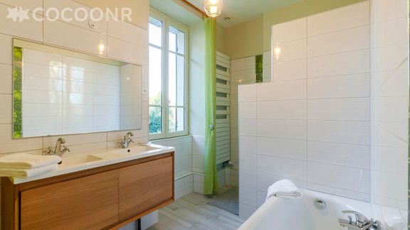 - Salle de bain avec deux lavabos, du rangement, une baignoire et une douche italienne.