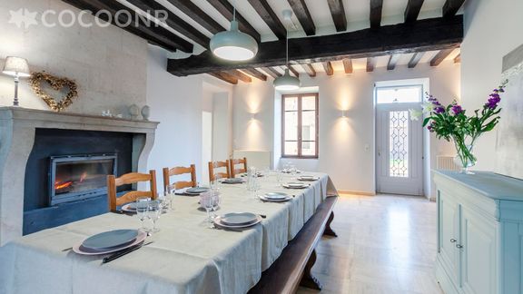 - Salle à manger avec une grande table familiale pour de bons repas conviviaux au coin du feu. La cheminée à insert fonctionne et le bois de chauffe est fourni.