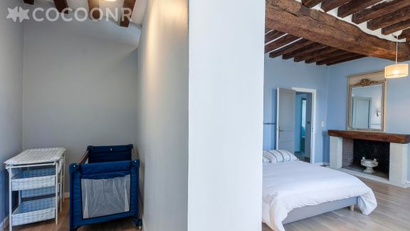 - Chambre 3 : Très grande chambre avec lit double (160x190cm) et un espace bébé indépendant, équipé d'un lit parapluie et d'une table à langer, une armoire et une belle cheminée de décoration.