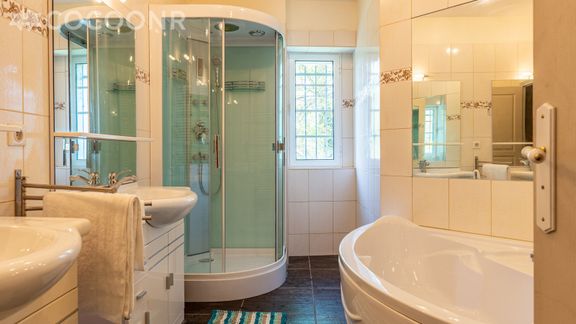 - Salle de bain spacieuse avec double vasque, douche à jets et baignoire.