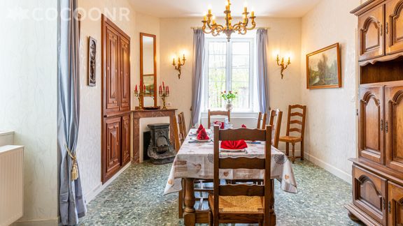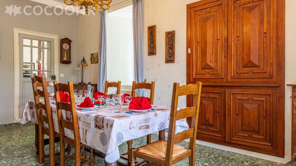- Salle à manger baignée de lumière, aménagée d'une grande table pouvant accueillir jusqu'à 12 convives, d'un buffet, d'une cheminée décorative et d'un piano droit (merci de l'utiliser avec soin).