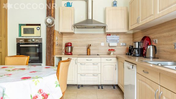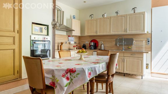 - Grande cuisine lumineuse entièrement équipée : table à manger, 5 chaises, lave-vaisselle, four, cafetière Nespresso, grille-pain, bouilloire, réfrigérateur, congélateur, plaques de cuisson, vaisselle et couverts.. .