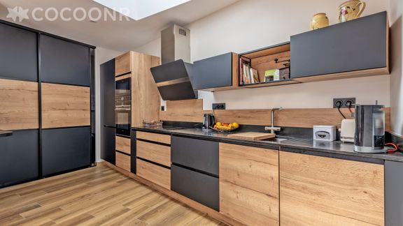 - Une cuisine équipée avec notamment : bouilloire électrique, four, four à micro-ondes, grille-pain, lave-vaisselle, plaques de cuisson...