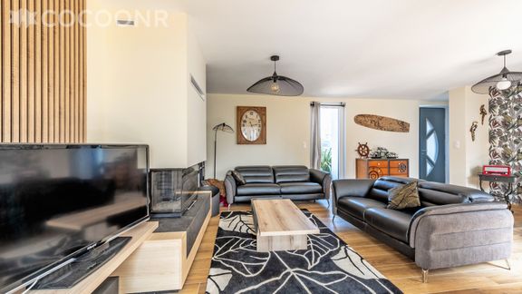 - Une pièce de vie de 50 m² avec TV, cheminée (bois fourni), canapés et d'un espace repas.
