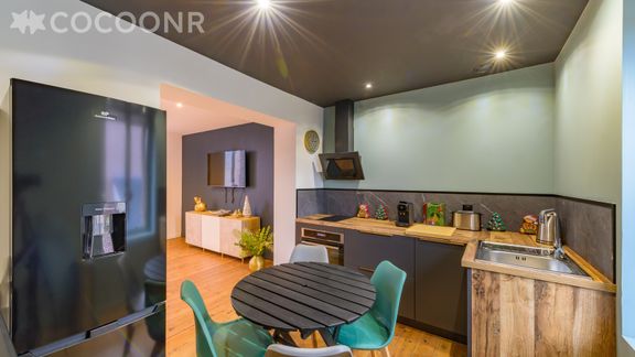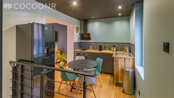 - Un escalier qui donne directement sur la cuisine neuve entièrement équipée avec tous les ustensiles, une table ronde avec 4 chaises avec notamment : un réfrigérateur, congélateur, bouilloire électrique, four, four à micro-ondes, grille-pain, lave-vaisselle, plaques de cuisson...