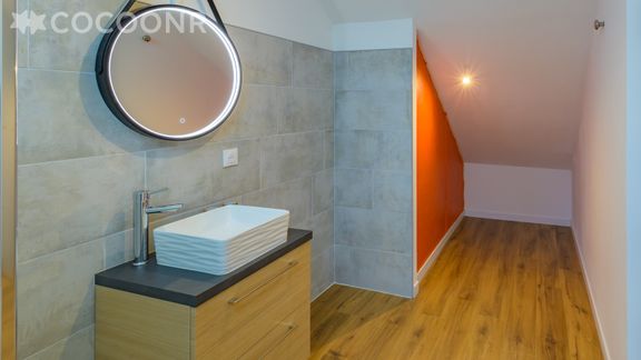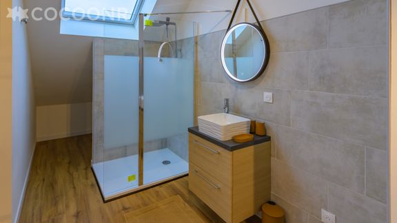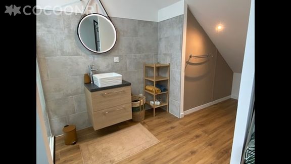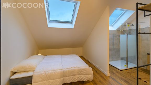 - Une chambre avec un lit queen-size (160X200), grande salle d'eau avec douche à l'italienne, meuble vasque, penderie et commode pour rangement.