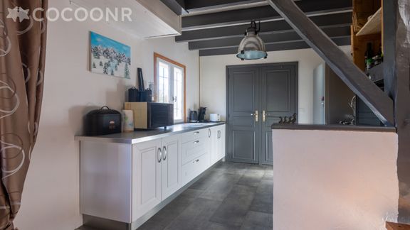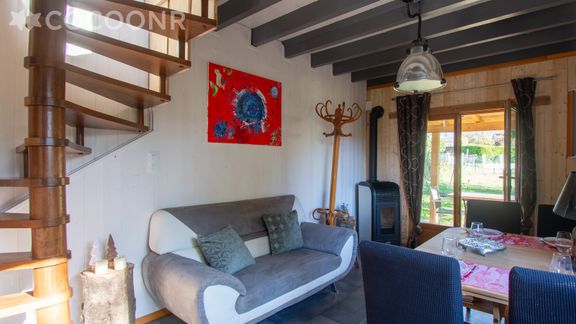 - Une pièce de vie de 30 m² avec smart TV, canapé, espace repas et une cuisine équipée avec notamment : bouilloire électrique, four, four à micro-ondes, grille-pain, plaques de cuisson...
