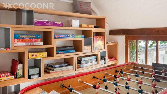 - Une grande salle de jeux avec baby foot, écran cinéma, jeux de société, livres et bandes-dessinés
