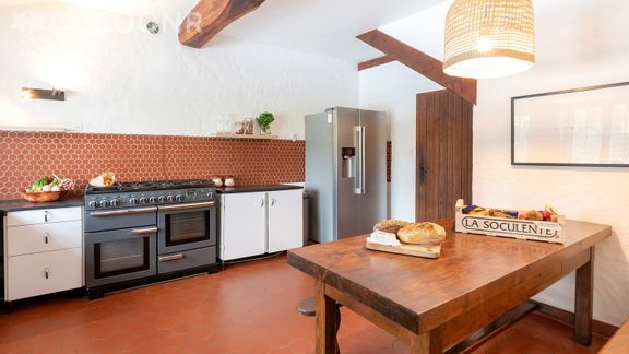 - Une cuisine équipée avec notamment : une grande piano de cuisson avec double four Falcon, machine Nespresso, bouilloire électrique, four à micro-ondes, grille-pain, lave-vaisselle, lave-linge...
